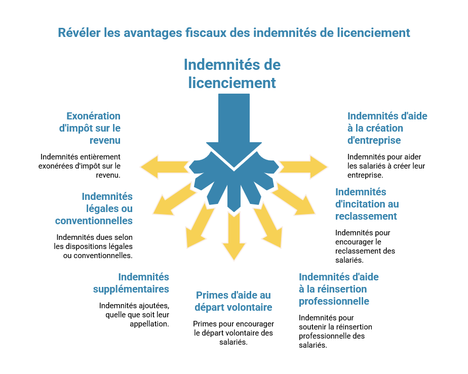 Il est important de noter que sont concernées par le dispositif d'exonération l'ensemble des indemnités inscrites à un plan de sauvegarde de l'emploi, quel que soit le mode de rupture du contrat de travail. Il s'agit non seulement des indemnités dues en application des dispositions légales ou conventionnelles, mais aussi, celles qui s'y ajoutent et qui ont fait l’objet d’une négociation avec les organisations syndicales. Elles peuvent être :