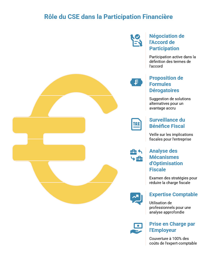 Le CSE a un rôle essentiel dans la négociation de l’accord de participation et la proposition éventuelle de recours à une formule dérogatoire plus avantageuse pour les collaborateurs. Le CSE a aussi une vigilance à avoir sur le montant du bénéfice fiscal et les mécanismes d’optimisation fiscale notamment.